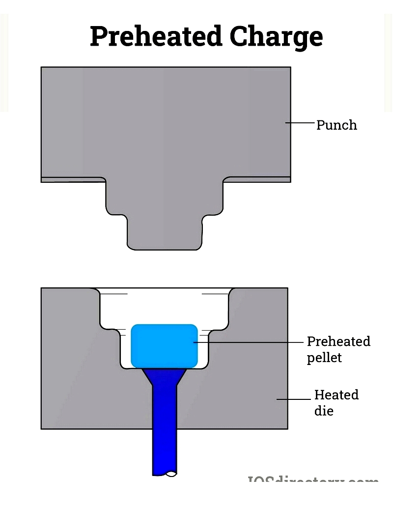 This phase positions the charge in the mold's lower section to optimize compression results. The charge distribution considers mold shape, desired thickness, and other factors.