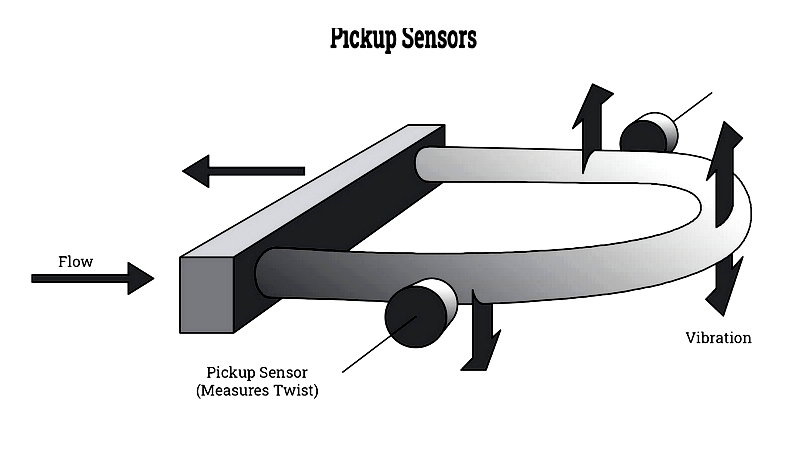 Electrodynamic sensors monitor tube motion, detecting phase shifts that indicate flow rate. This system provides measurements independent of fluid properties.