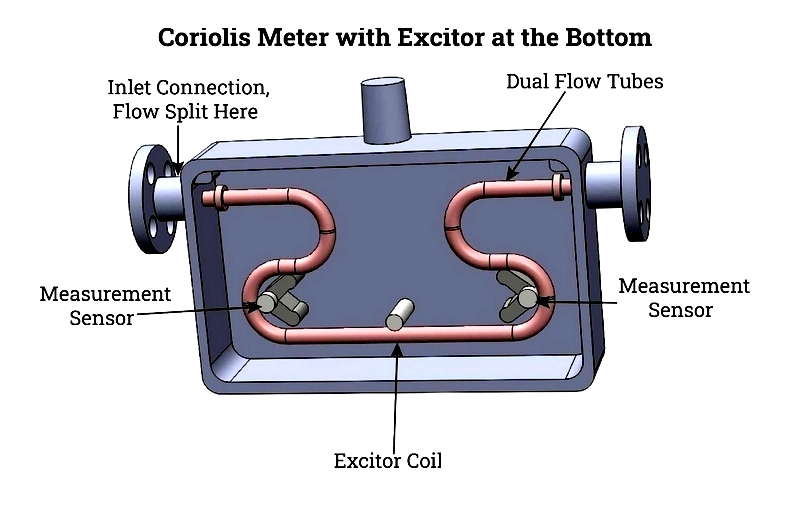 The exciter maintains tube oscillations essential for measurement. Positioned between sensors, it ensures accurate detection of flow-induced changes.