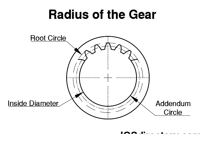 Gear radius dimensions vary by type. Combined, pitch and addendum radii determine pitch circle diameter.