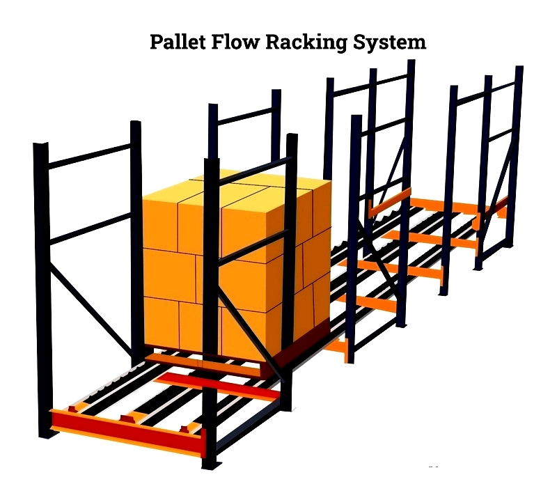 Gravity flow racking employs inclined roller tracks for automatic pallet movement, implementing FIFO inventory management. Ideal for perishable goods or high-turnover products, these systems reduce picking time and handling requirements while ensuring proper product rotation for freshness compliance.