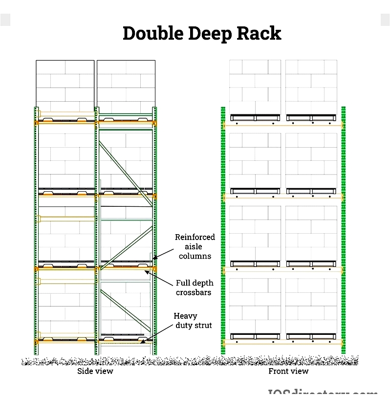 Double deep racking increases storage density by placing two rows of selective racks back-to-back. This configuration requires specialized forklifts for accessing rear pallets and operates on a FILO inventory system. Particularly beneficial for medium-turnover inventory, double deep racking is commonly used in food storage and distribution centers where space optimization is critical.