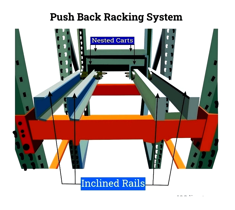 Push back racking utilizes inclined rails and nested carts to store multiple pallets in a single lane, operating on a LIFO system. This high-density solution reduces aisle requirements and improves workflow for high-volume operations, making it suitable for batch-picked products or refrigerated goods.