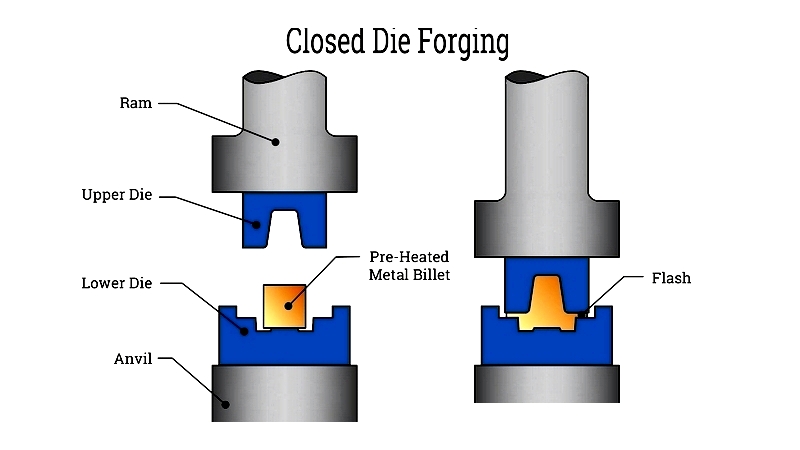 While die setup costs are higher, closed die forging is economical for high-volume production. Die life typically ranges from 5,000 to 7,000 cycles, depending on complexity and materials.
