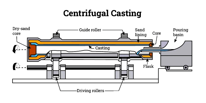 Molten metal is poured into a rotating mold, creating dense, uniform parts like pipes and bushings. Production rates are 30-50 pieces per hour, with mass limits up to 9000kg.