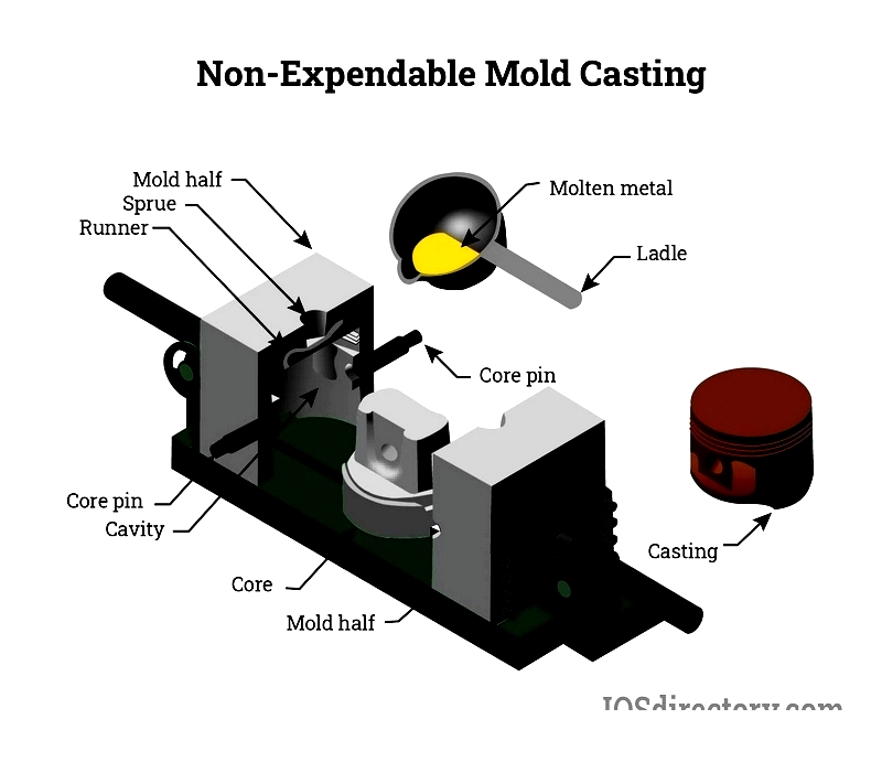 This technique uses reusable iron or steel molds, filled by gravity or pressure. It's ideal for aluminum, copper, and magnesium parts like pistons and cylinder heads, offering superior finishes and properties.