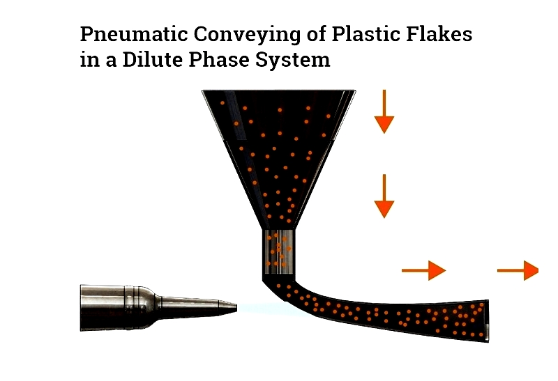 The accompanying image demonstrates pneumatic conveying in action, showing plastic flakes being transported in a dilute phase system with an eductor valve.