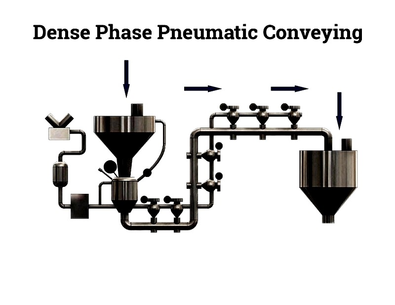 Dense phase systems use high-pressure, low-velocity airflow to move materials in slugs, minimizing product degradation and pipe abrasion. This method suits fragile or abrasive materials like food ingredients and minerals, operating with high product-to-air ratios for gentle handling.