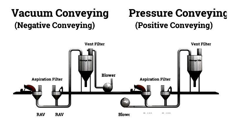 The diagram below contrasts vacuum and pressure systems. Vacuum systems position the blower downstream, while pressure systems place it upstream to push materials toward storage.