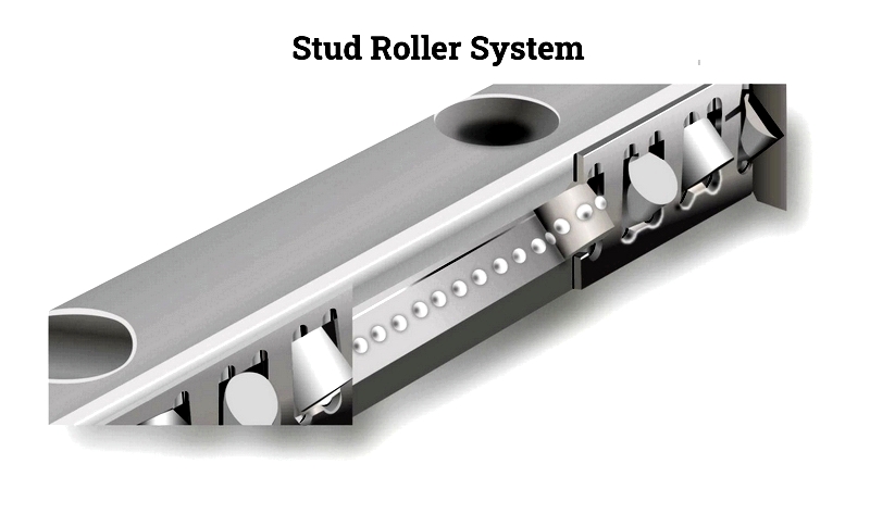 Crossed roller bearings require rails twice the travel length; plastic cages enable longer strokes.