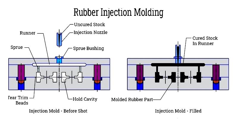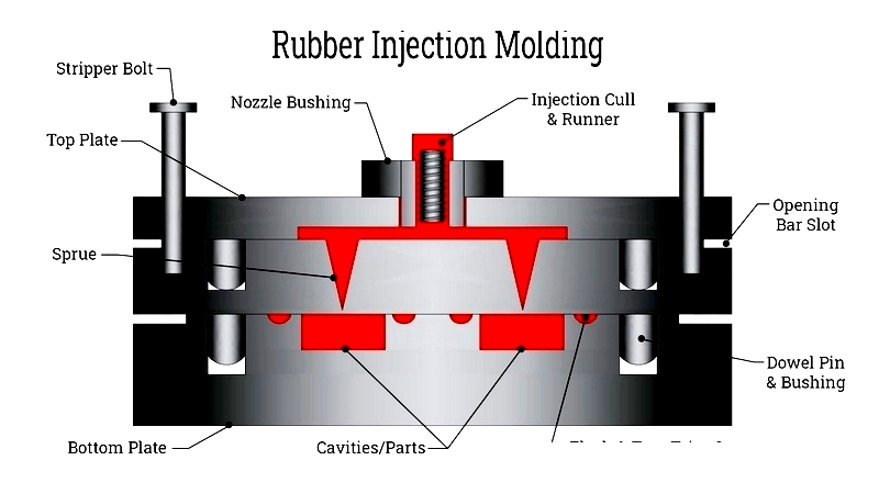 Rubber enters through runners and sprues, filling cavities precisely via gates to form the desired shape.